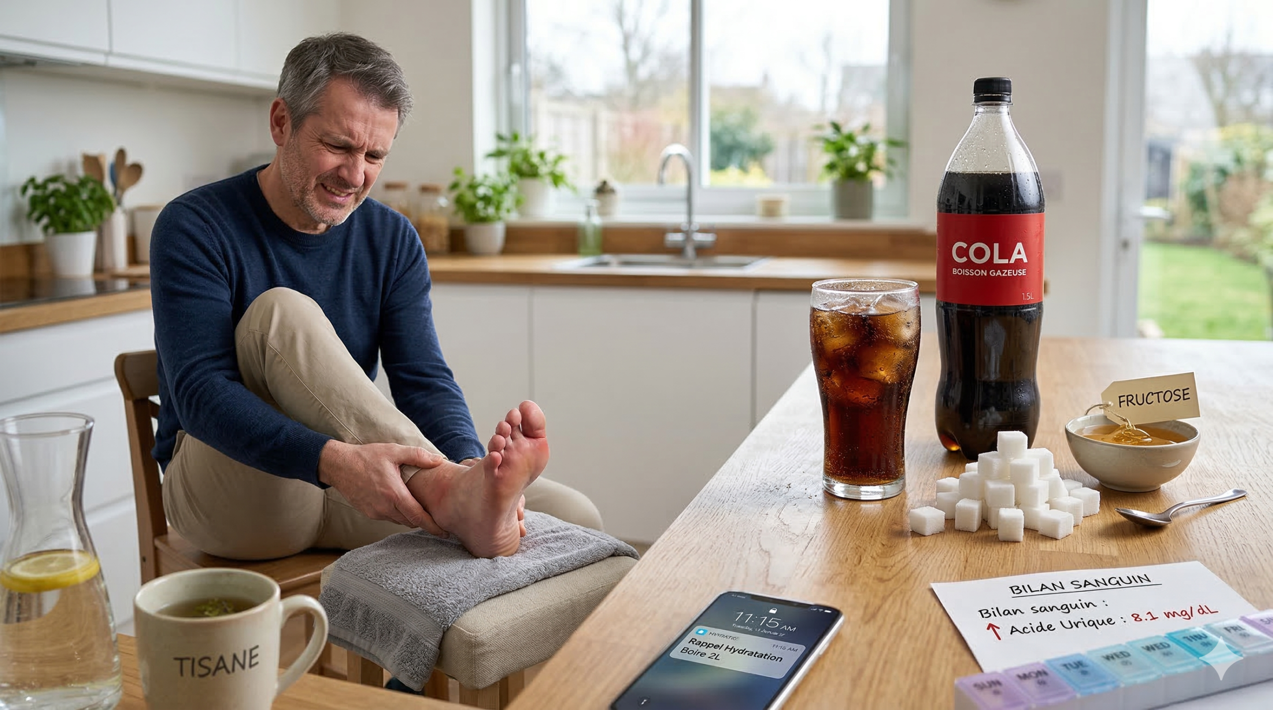 Le Coca‑Cola ne réhydrate pas efficacement. Sa teneur en sucre et en sodium ralentit l’hydratation cellulaire. Quand le corps manque d’eau, l’acide urique dans le sang devient plus concentré. Cette concentration favorise la cristallisation dans les articulations. C’est souvent dans les périodes chaudes, ou après un repas copieux sans eau, que les crises surviennent. Boire de l’eau régulièrement — au moins 1 à 1,5 L par jour en prévention, jusqu’à 2 L par jour lors d’une crise — aide les reins à éliminer l’acide urique par les urines. C’est l’un des leviers les plus simples et les plus puissants.
