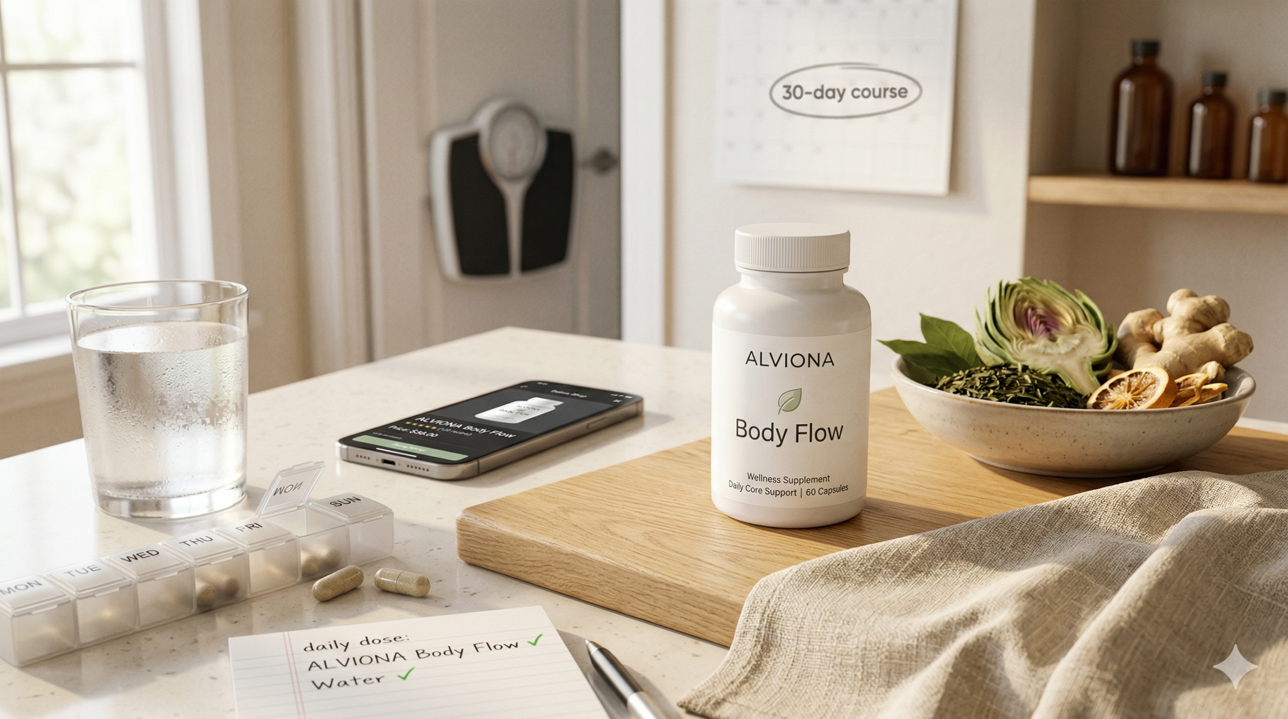 • Alviona Body Flow est un complément alimentaire végétal en 60 capsules, pas un médicament.