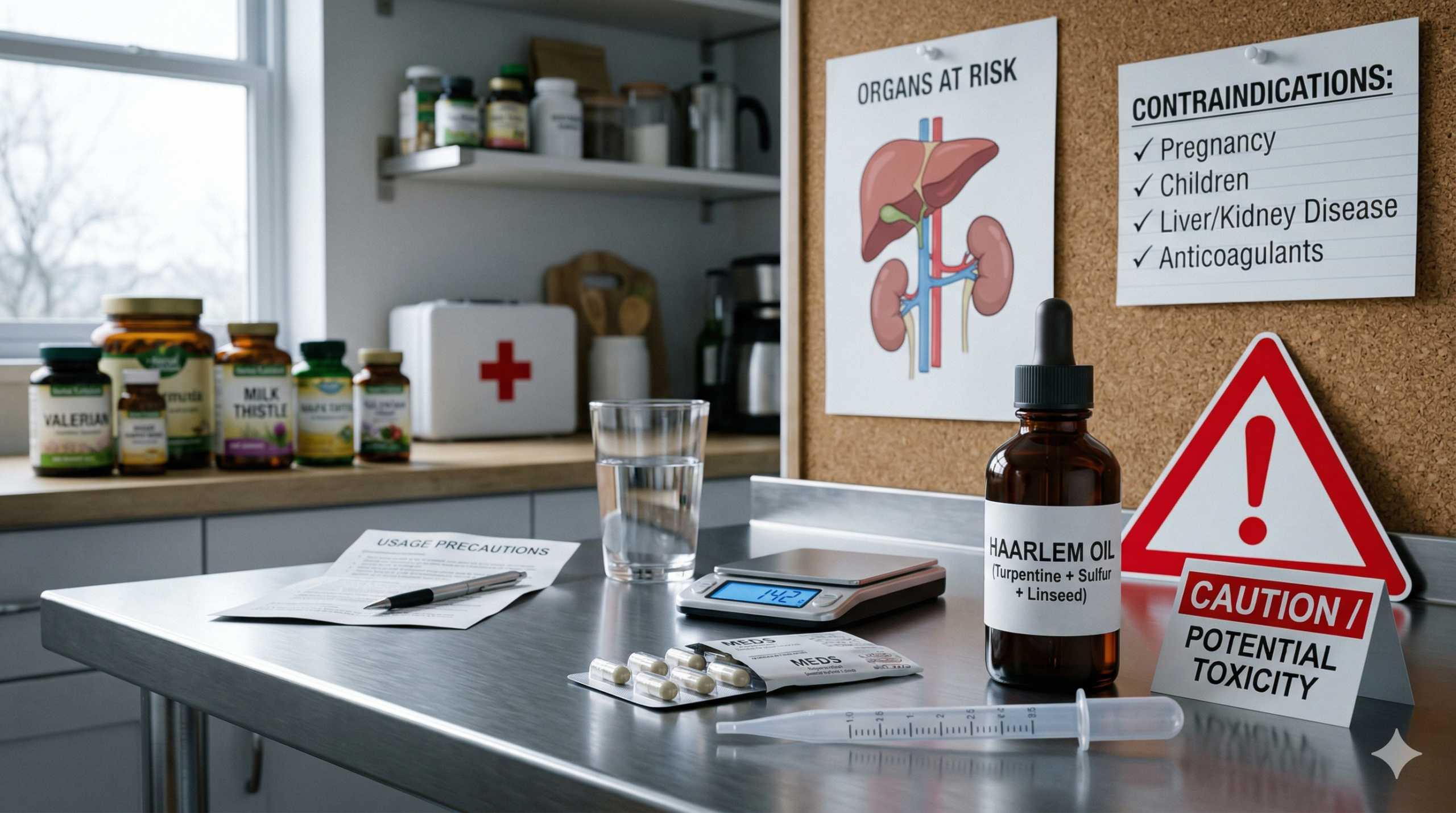 L’huile de Haarlem peut présenter des risques réels, surtout en cas de mauvais usage, de terrain fragile ou de produit de qualité douteuse. Ce n’est pas un remède anodin. Avant d’en prendre, voici ce que vous devez savoir :